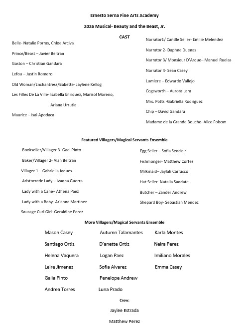 The 60-minute musical is based on the 1994 Broadway production and Disney’s 1991 animated feature film. The Ernesto Serna Fine Arts Academy cast includes 50 Kindergarten-8th grade students led by theater director Michelle Gandara, along with the following production crew: